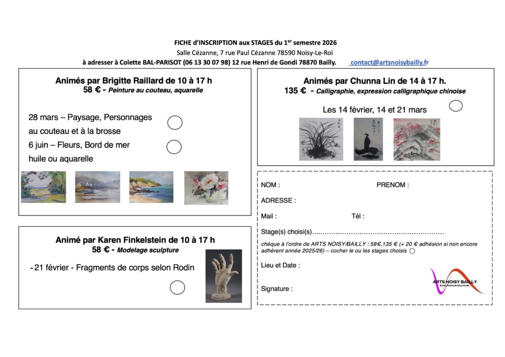 Les stages Stages ouverts : Inscrivez-vous en écrivant à contact@artsnoisybailly.fr ou en appelant le 06 13 30 07 98. Cliquez sur le formulaire et imprimez-le. Stages terminés Cliquez sur l’affiche pour plus de détails.